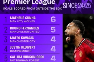 上赛季至今英超禁区外进球榜:库尼亚压B费居首,帕尔默在列