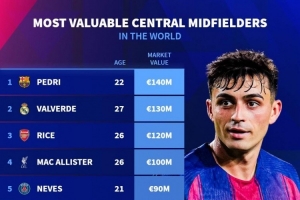 体育资讯11月2日讯 德国转会市场列出了中场中路球员(Central Midfielders)身价排名,佩德里、巴尔韦德、赖斯前三。