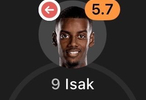 值得注意的是,伊萨克近15次在俱乐部和国家队出场,只打入了1球。