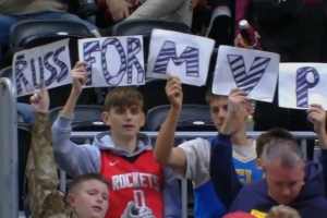 在本场比赛中,有一位身穿火箭0号的球迷举着威少MVP的牌子。